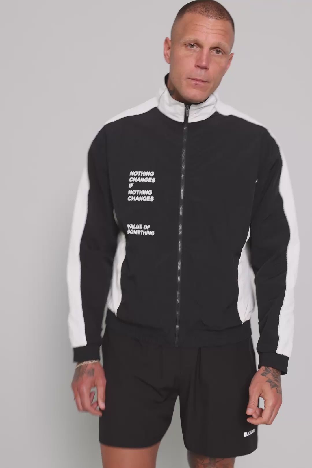 MALE MODEL IN SHORTS 198 CM, WEARING THE JACKET IN SIZE L
